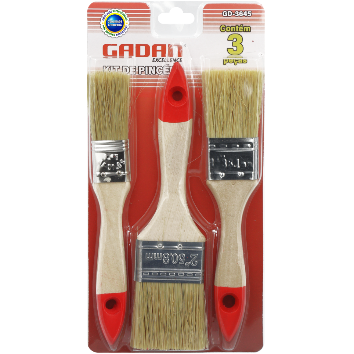 Kit com 3 pincéis de madeira de tamanhos variados.